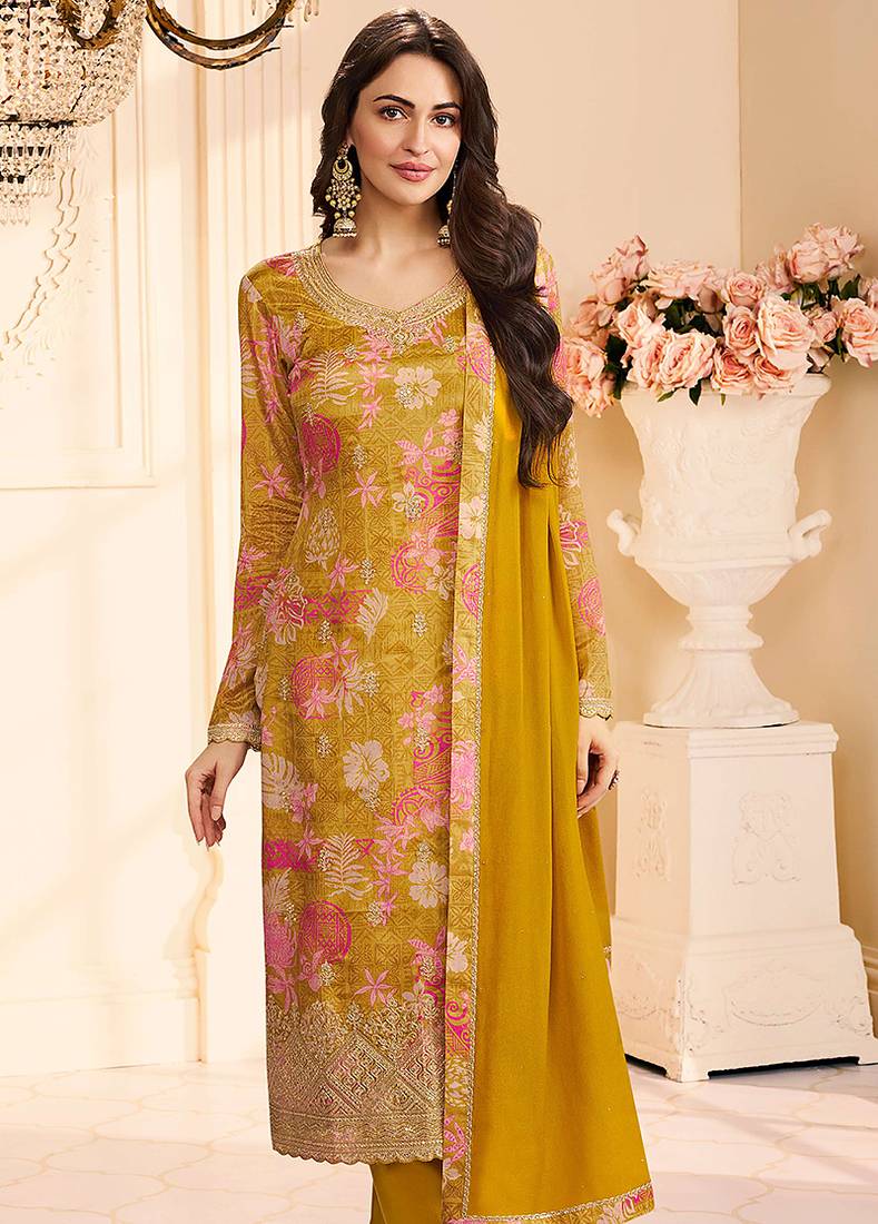 Mustard chinon silk floral printed and embroidered salwar kameez semi stitched