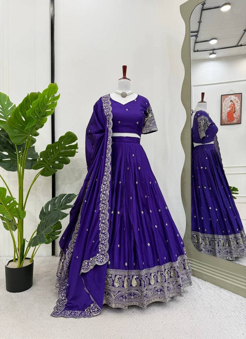 Purple chinon silk thread with sequin lehenga set with choli and dupatta