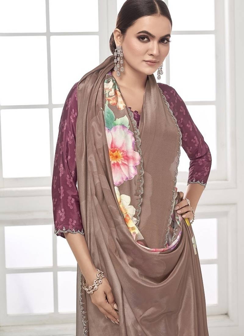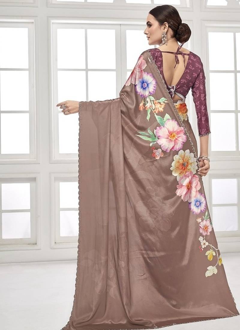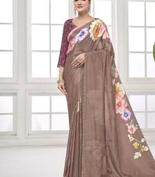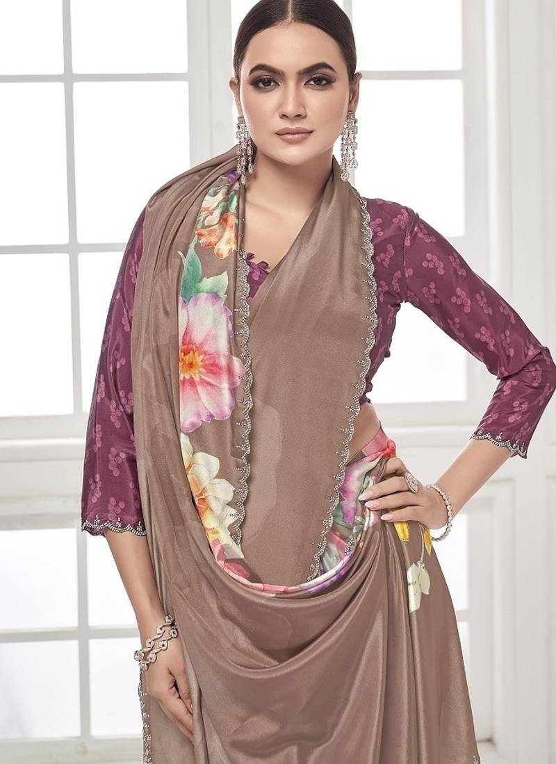 Coffee premium printed saree with blouse or saraowski border