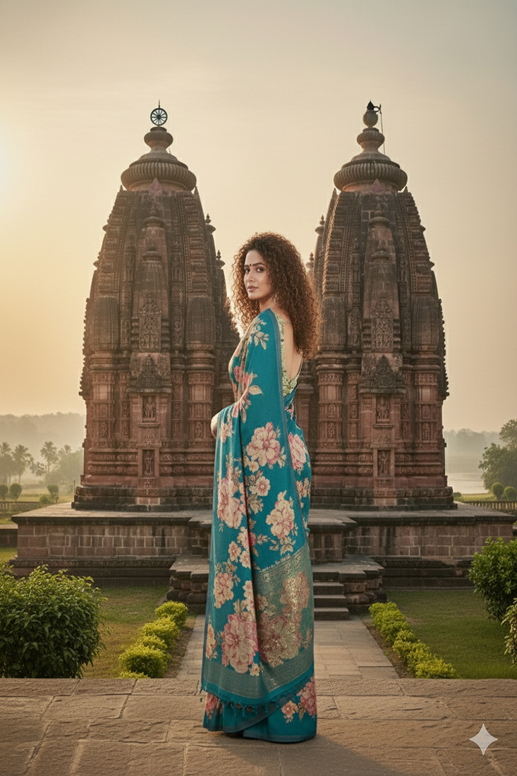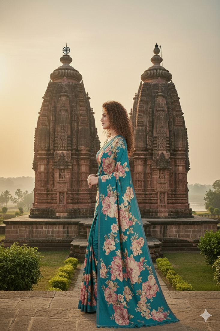 | Product Name | Teal Blue Premium Printed Saree With Blouse | |