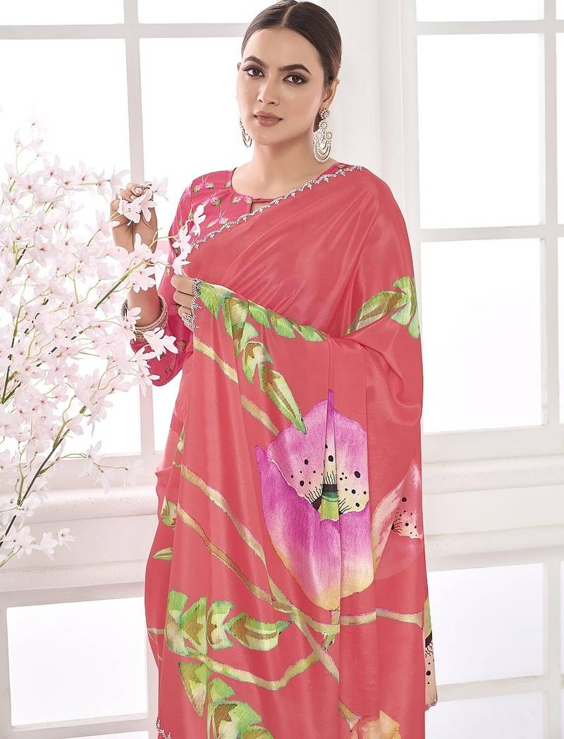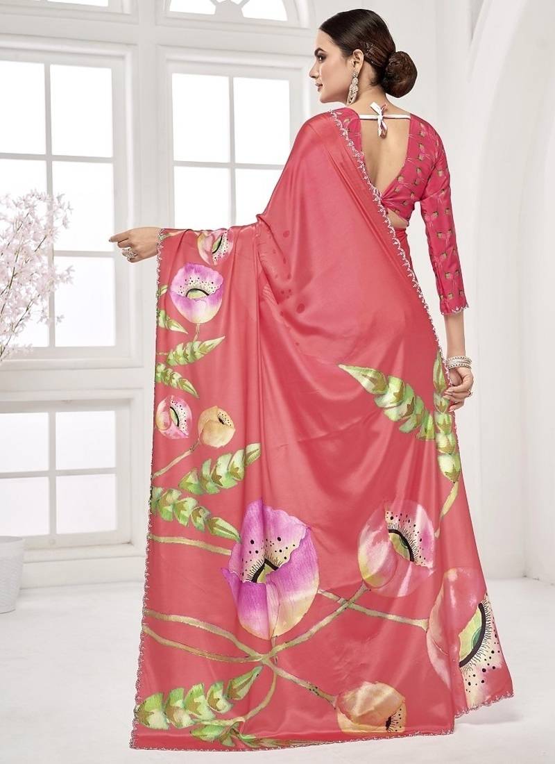 | Product Name | Melon Pink Premium Printed Saree With Blouse Or Saraowski Border | |
