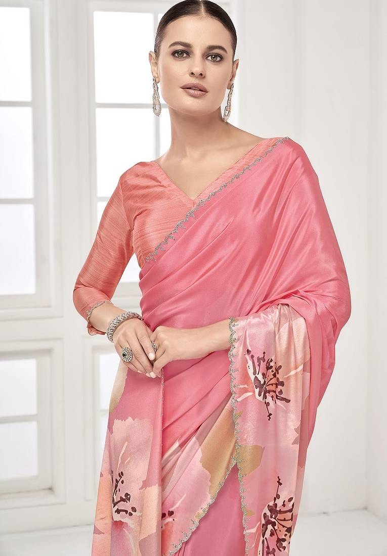 Pink premium printed saree with blouse or saraowski border