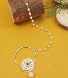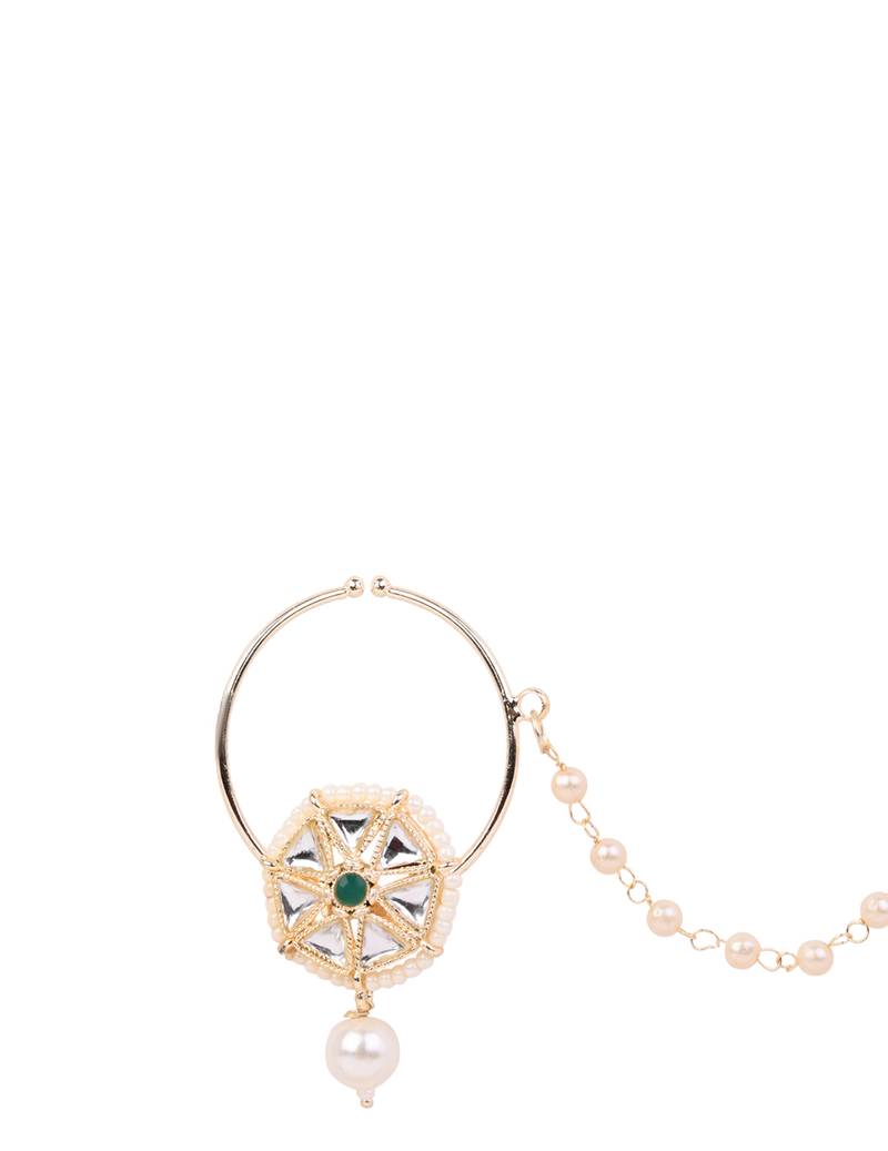 | Product Name | Gold Plated Traditional Bridal Nath/Nose Ring Without Piercing With Pearl Chain & Stone For Women (Green) | |