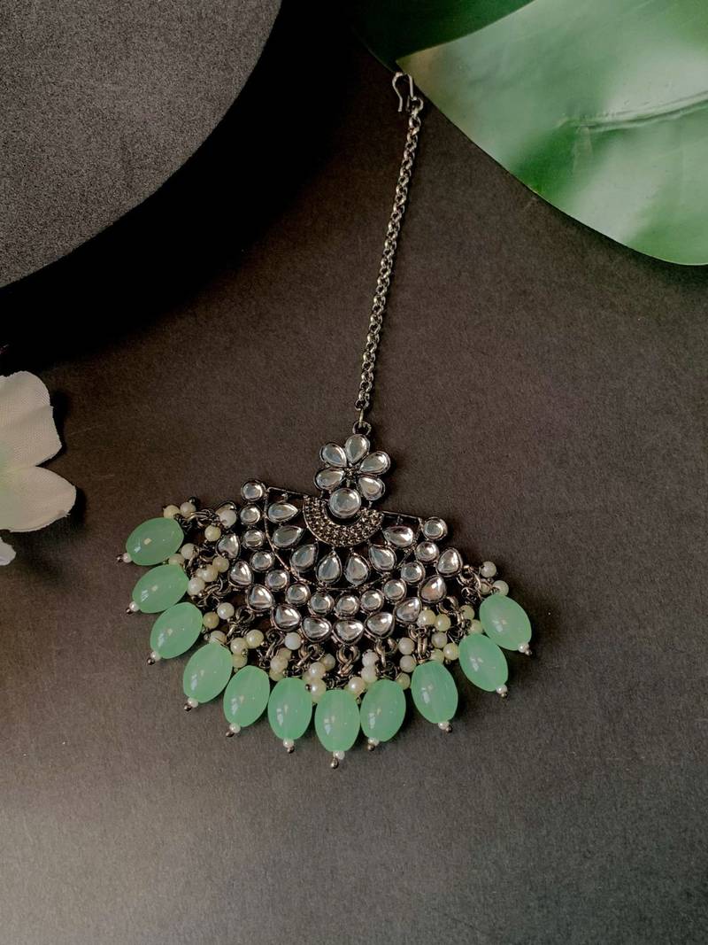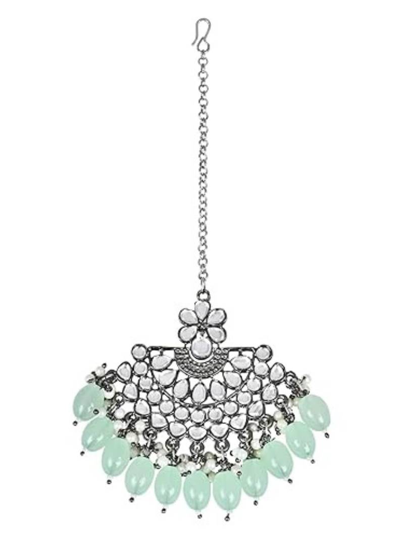 Silver oxidised traditional kundan pearl maang tikka for women and girls (t3106zmin)