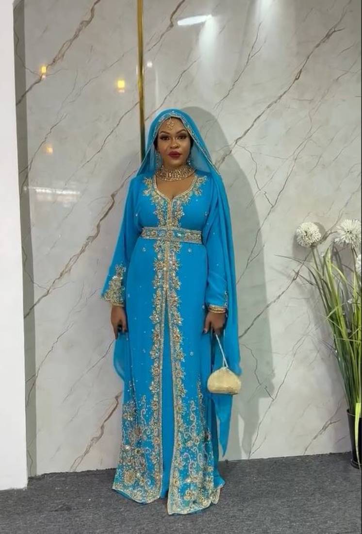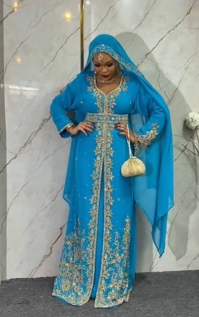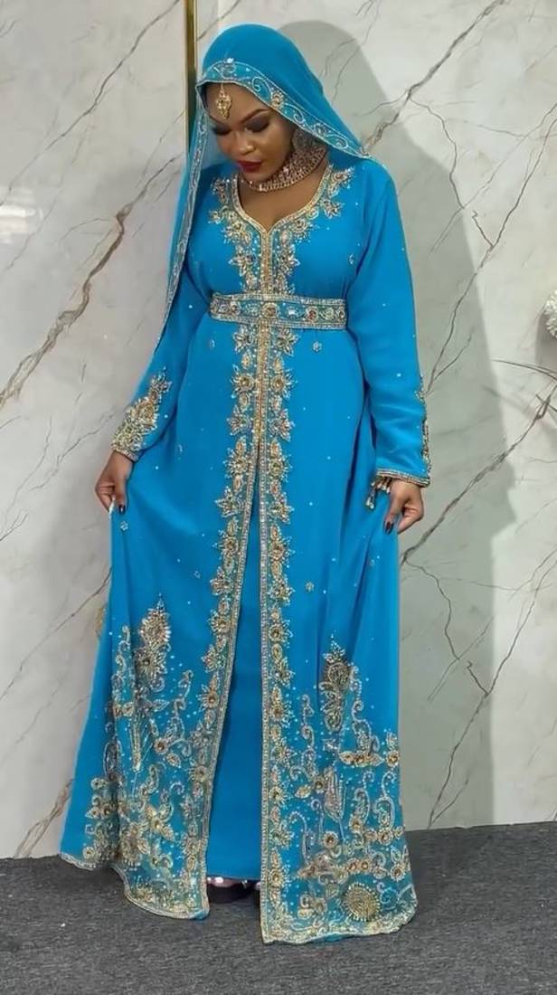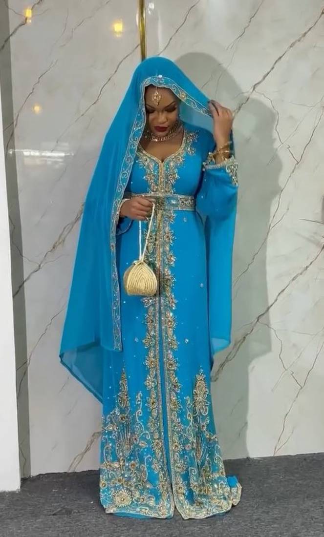 | Product Description | Moroccan Caftan In Firozi With Gold Embroidery, Which Is A Popular Style For Formal Occasions Like Weddings And Eid Celebrations In Middle Eastern And Muslim Cultures. The Dress Style Is Often Referred To As A Dubai Kaftan Or Abaya. |