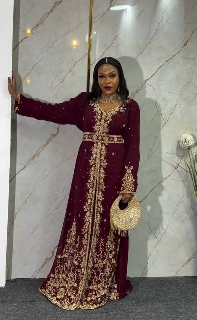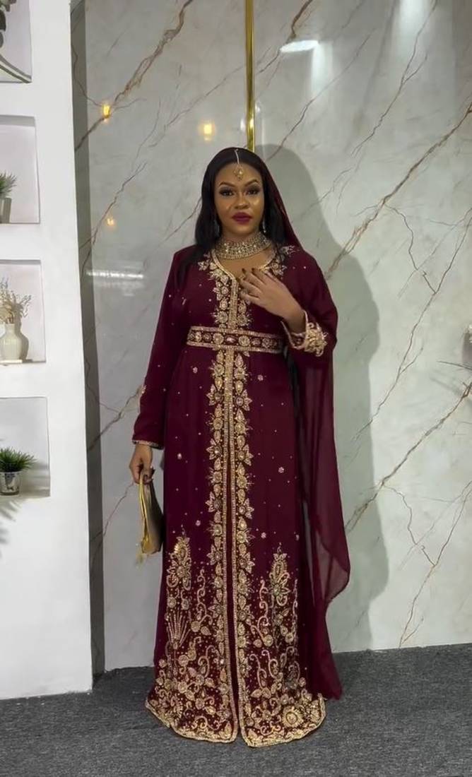 | Product Description | Moroccan Caftan In Maroon With Gold Embroidery, Which Is A Popular Style For Formal Occasions Like Weddings And Eid Celebrations In Middle Eastern And Muslim Cultures. The Dress Style Is Often Referred To As A Dubai Kaftan Or Abaya. |