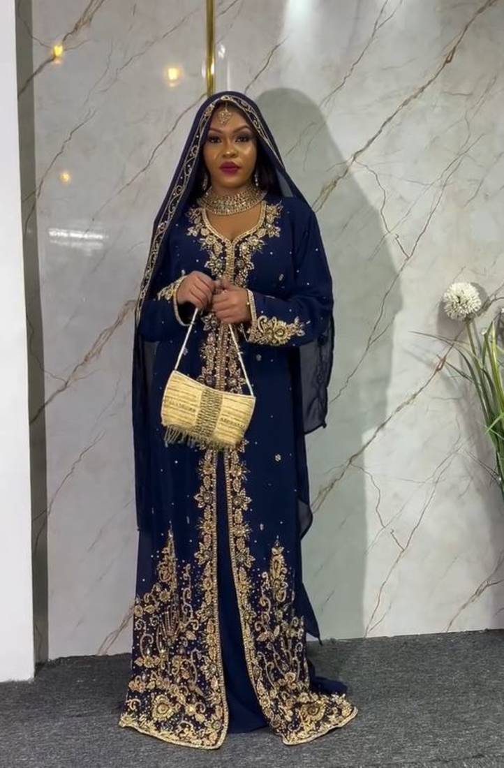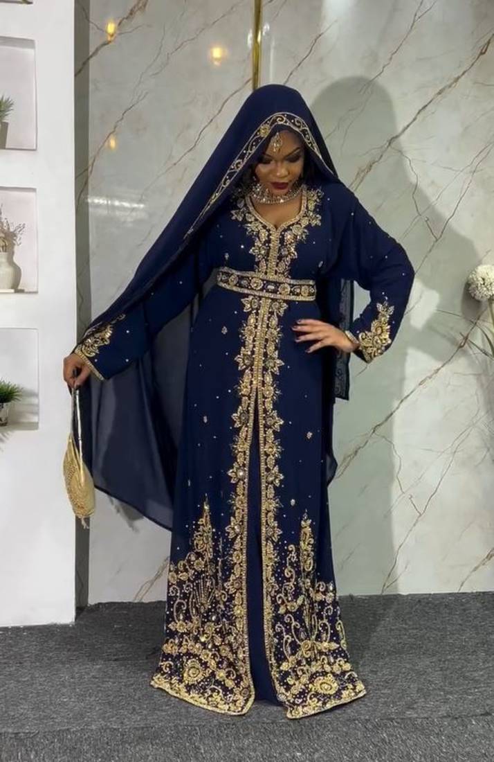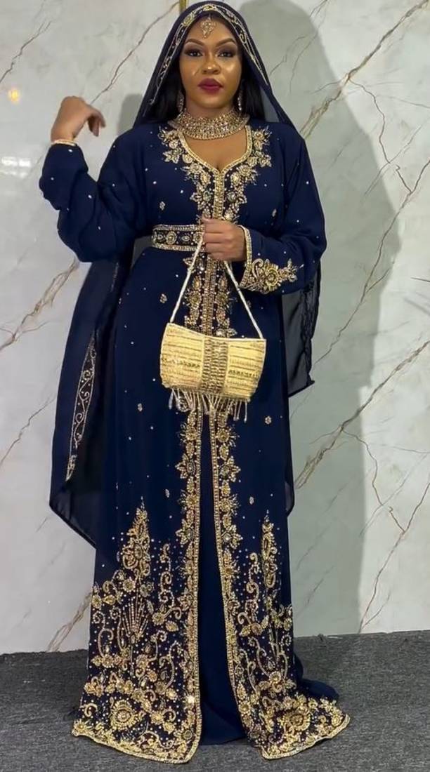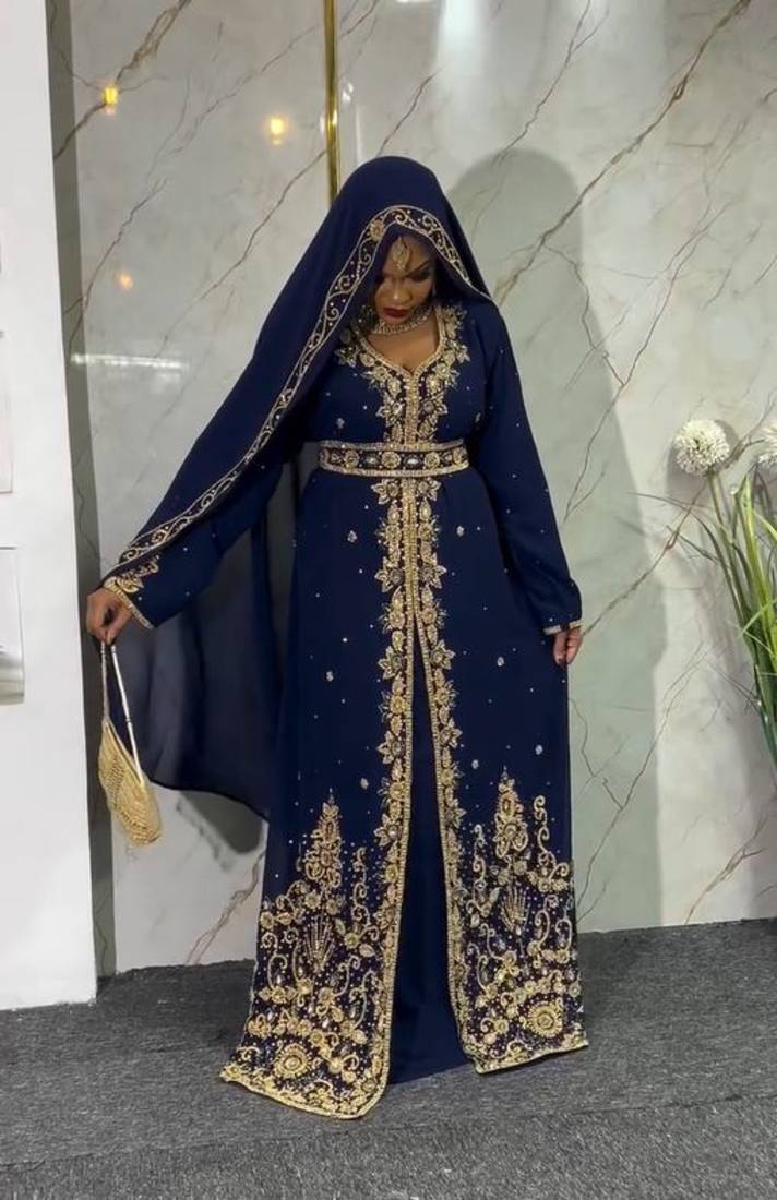 | Product Description | Moroccan Caftan In Navy Blue With Gold Embroidery, Which Is A Popular Style For Formal Occasions Like Weddings And Eid Celebrations In Middle Eastern And Muslim Cultures. The Dress Style Is Often Referred To As A Dubai Kaftan Or Abaya. |