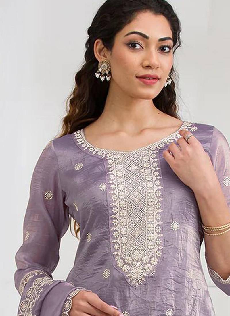 Lilac embroidered silk salwar-kameez unstitched