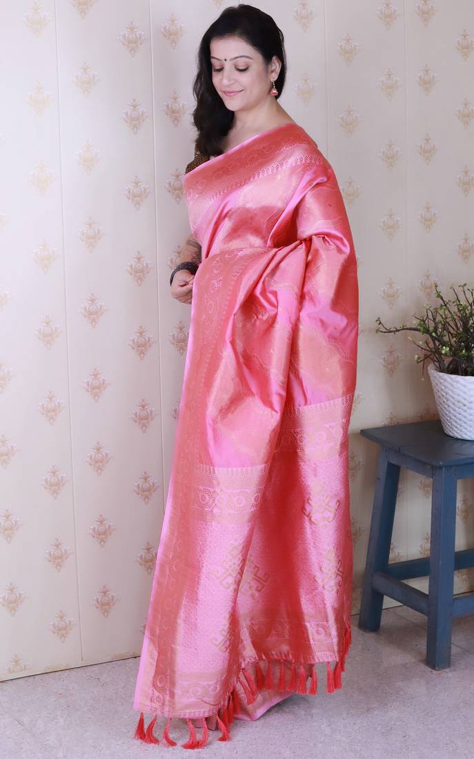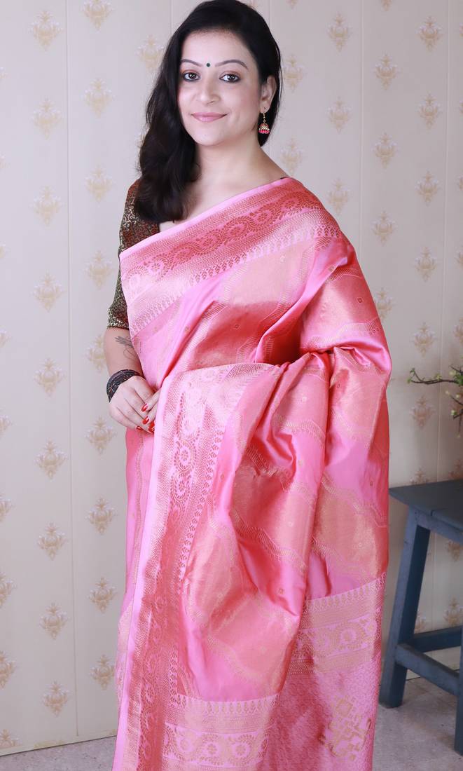 Baby pink color soft silk blend woven jari designer ethnic partywear saree