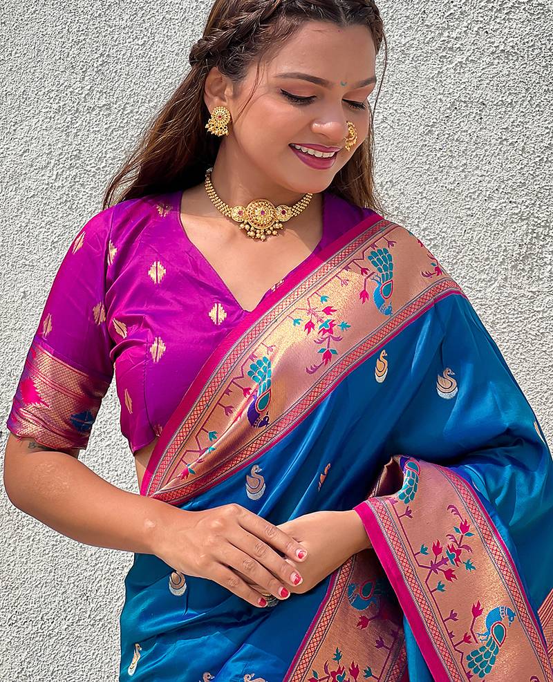 | Product Description | Looking These Party Wear Saree In Fine Colored.These Saree And Blouse Is Fabricated On Soft Silk.Its Beautified With Weaving Meenakari Paithani Designer. |