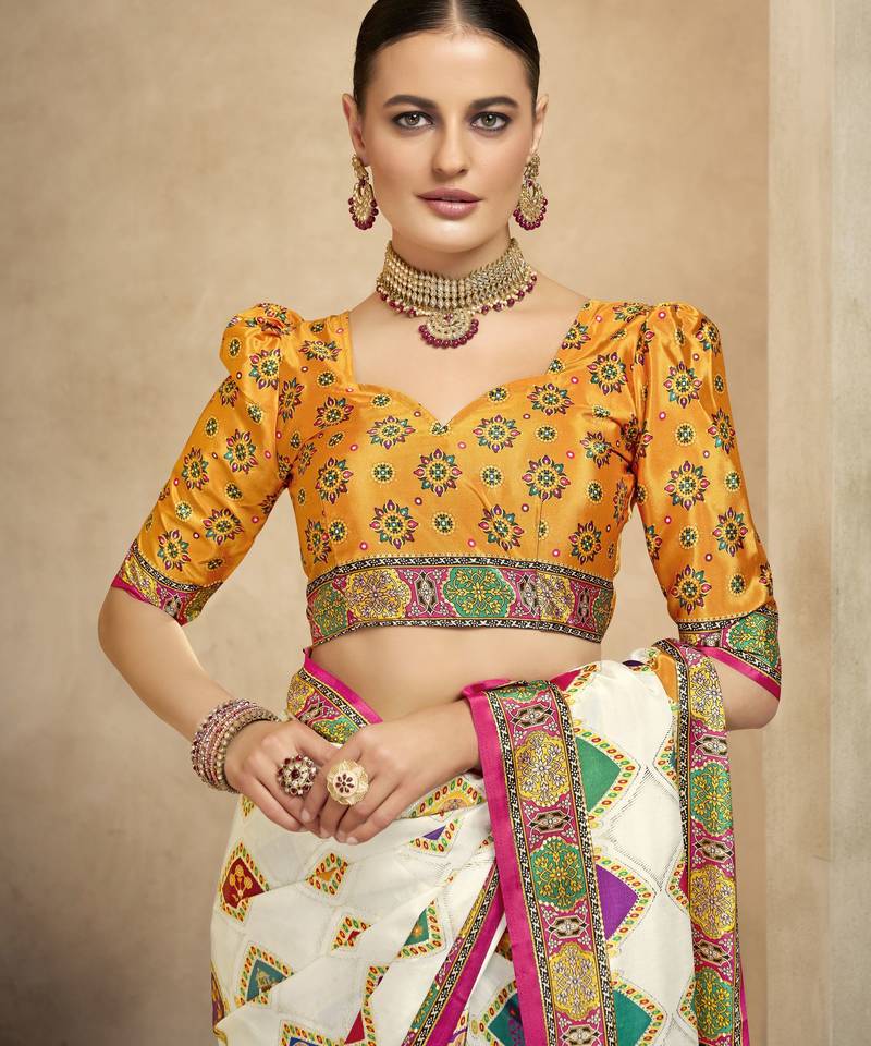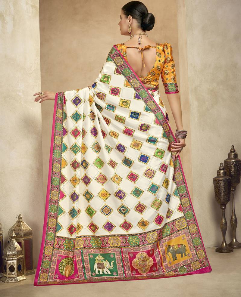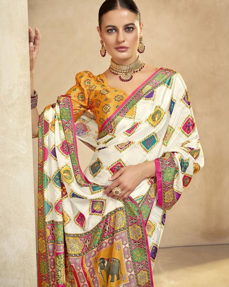 | Product Name | Graceful Ethnic Off White Color Bollywood Style Crepe Silk Blend Designer Digital Foil Printed Saree | |