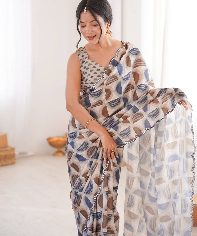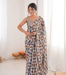 Grey color girlie chinon fabric designer digital printed ceremonial saree