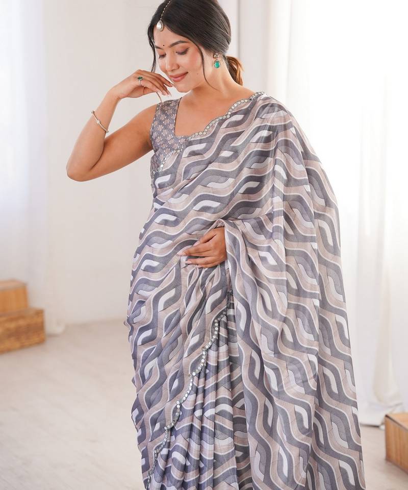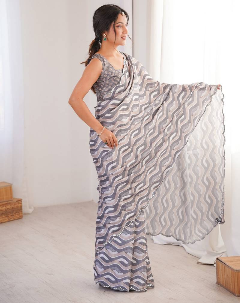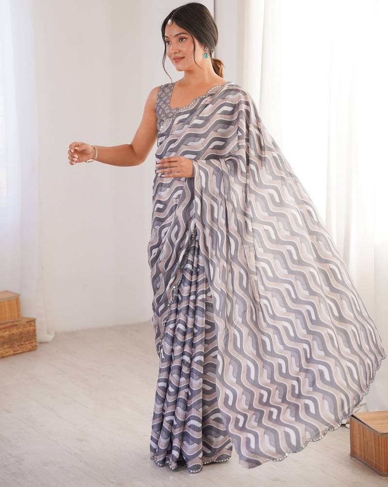 Grey color girlie chinon fabric designer digital printed ceremonial saree