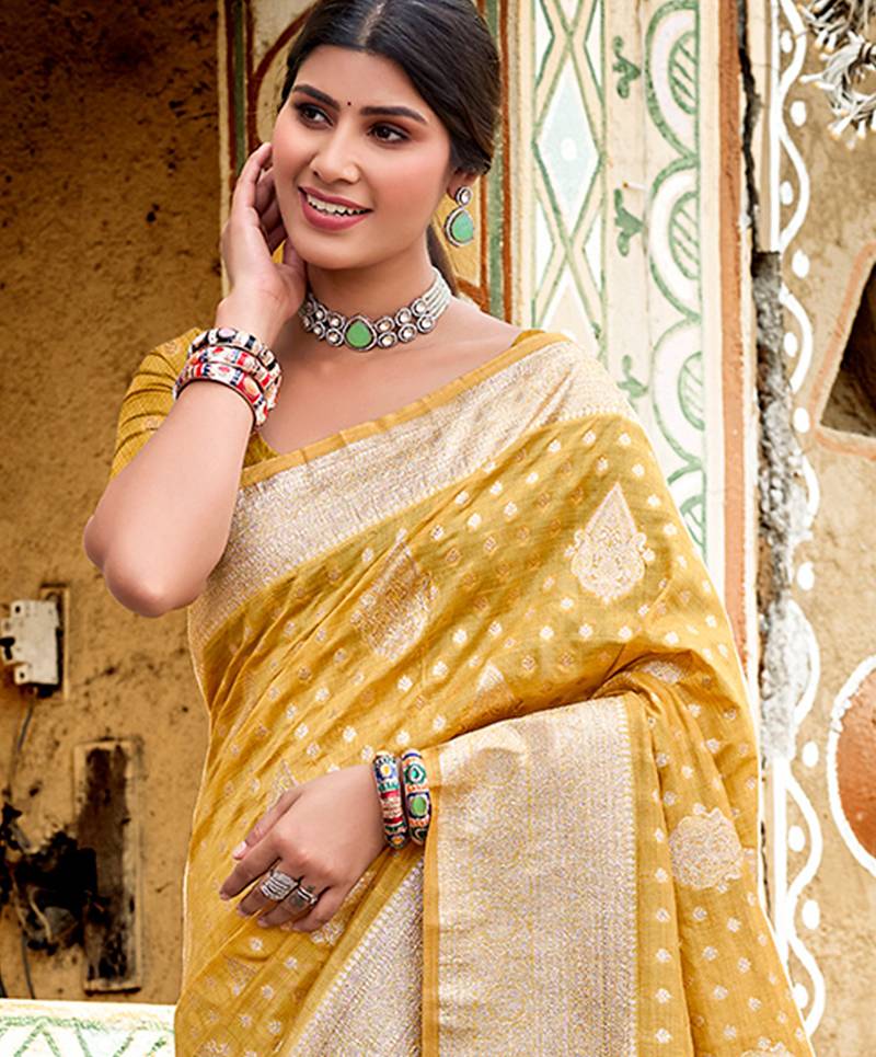 Mustard color assam silk blend fabric woven designer saree for party looks