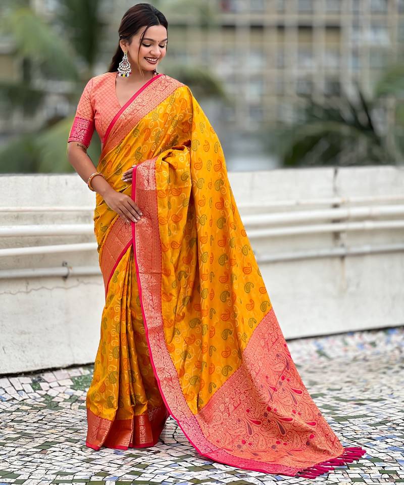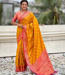 Mustard color patola silk blend fabric woven meenakari designer saree