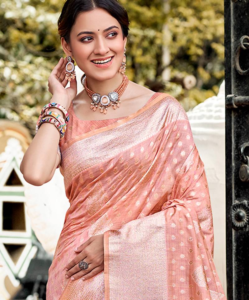Peach color assam silk blend fabric woven designer saree for party looks