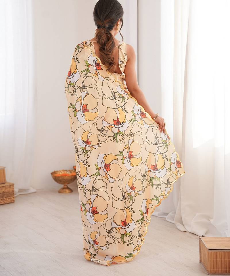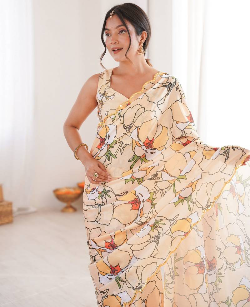 Peach color girlie chinon fabric designer digital printed ceremonial saree
