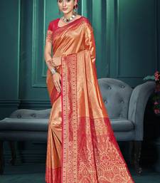 Peach color traditional kanjivaram silk blend blend saree with beautiful woven designer