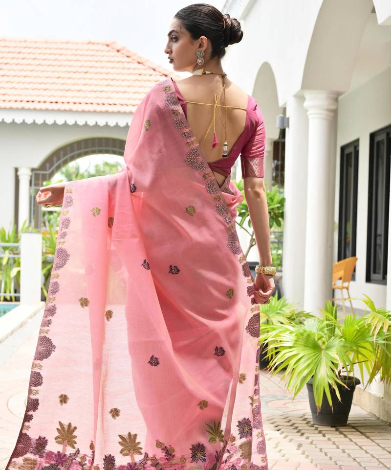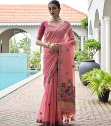 Pink color chanderi cotton fabric weaving reshan flower designer ethnic saree