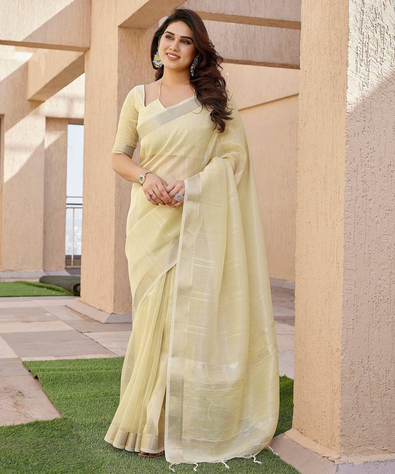Yellow color tissue linen art silk fabric weaving jari lining designer saree