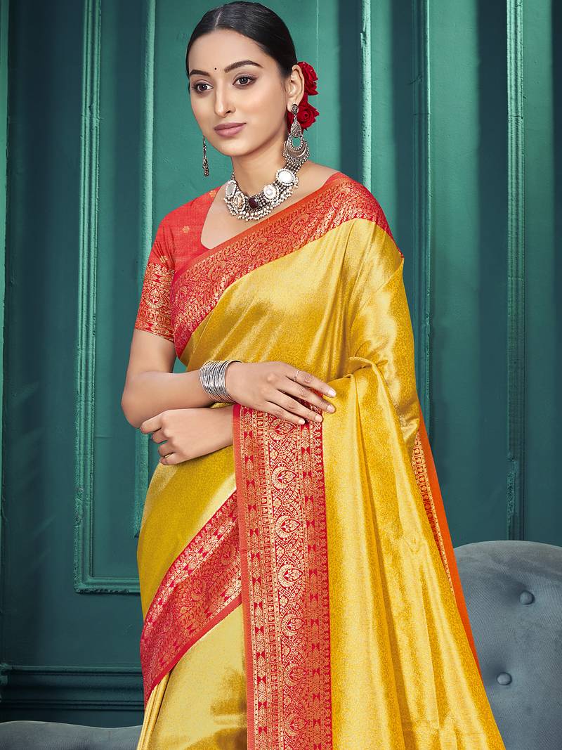 Yellow color traditional kanjivaram silk blend blend saree with beautiful woven designer
