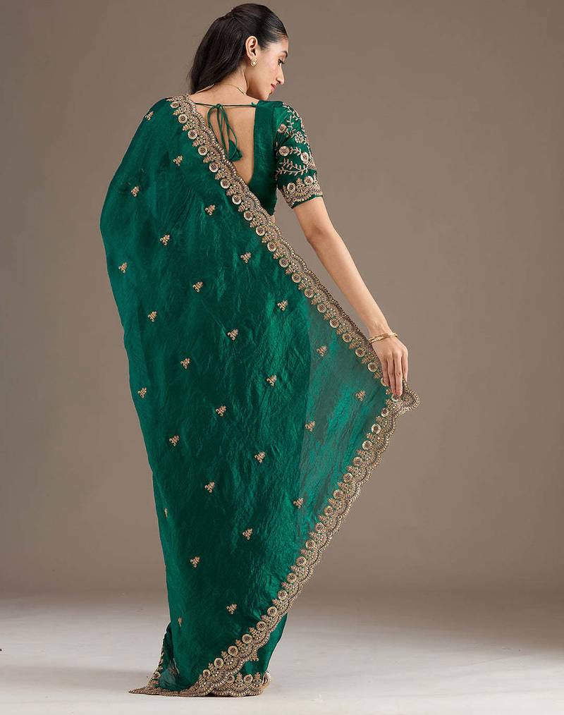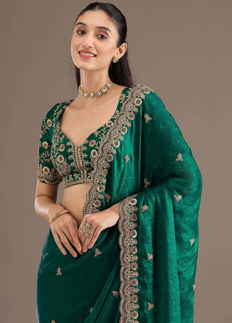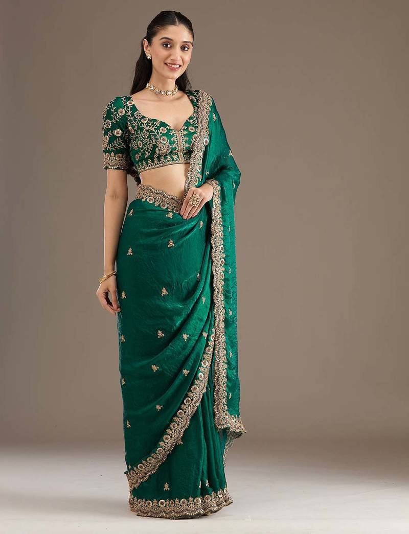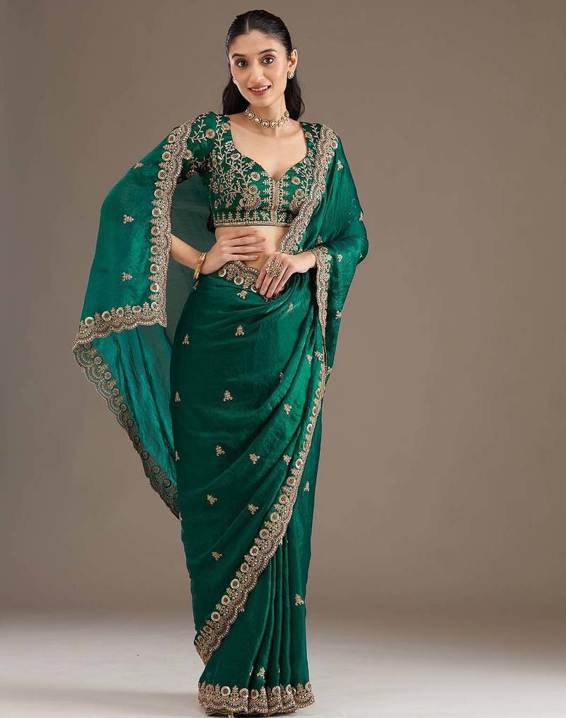 | Product Description | This Elegant Emerald Green Saree Is Crafted From Rich Satin Silk Fabric, Enhanced With Delicate Floral Embroidery And A Heavily Embroidered Border. Paired With A Matching Designer Blouse Featuring Detailed Craftsmanship, This Saree Exudes Timeless Grace And Festive Charm. Ideal For Weddings, Receptions, Festive Celebrations, And Special Occasions. |
