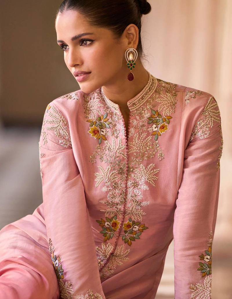 | Product Name | Baby Pink Chinnon Silk Crop Top Palazzo With Golden Zari Thread Floral Embroidery And Sequin Detailing 42") | |