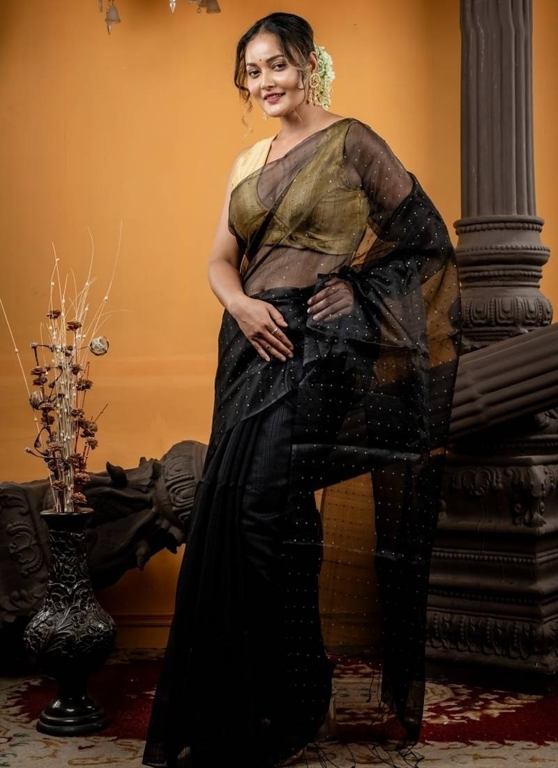 | Product Description | The Black Premium 'matka Muslin' Half &Half Bengal Handloom Saree Features A Plain Half Body Beautifully Contrasted By A Woven Antique Gold Small Sequins Half Body & Pallu, Creating A Delicate Interplay Of Texture & Shimmer.