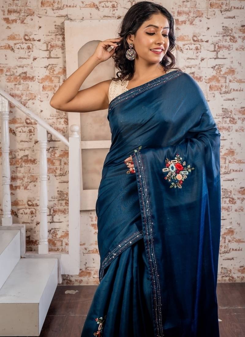 Blue embroidered tussar silk blend hand embroidery all seasons sarees