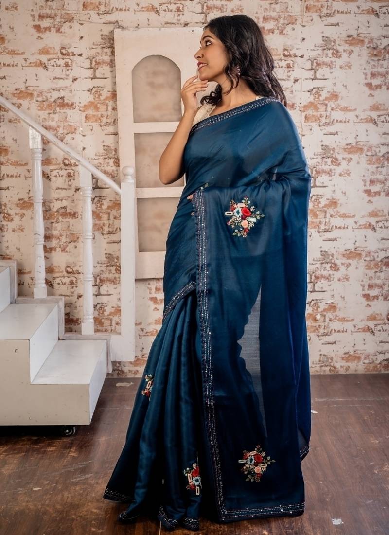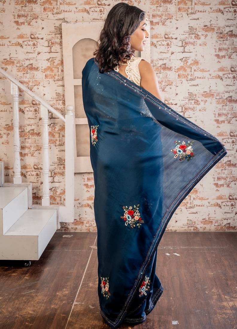 | Product Description | The Midnight Blue Soft Tussar Silk Saree Evokes Quiet Luxury & Timeless Beauty. The Deep Blue Base Is Hand Embroidered With All Over Multi Colour Resham Boolean Floral Motifs, Bringing Bursts Of Colour & Artistry To The Rich Fabric. Sequins & Mirror Highlights Are Delicately Scattered Across The Surface, Adding A Soft Shimmer Reminiscent Of A Starlit Night.