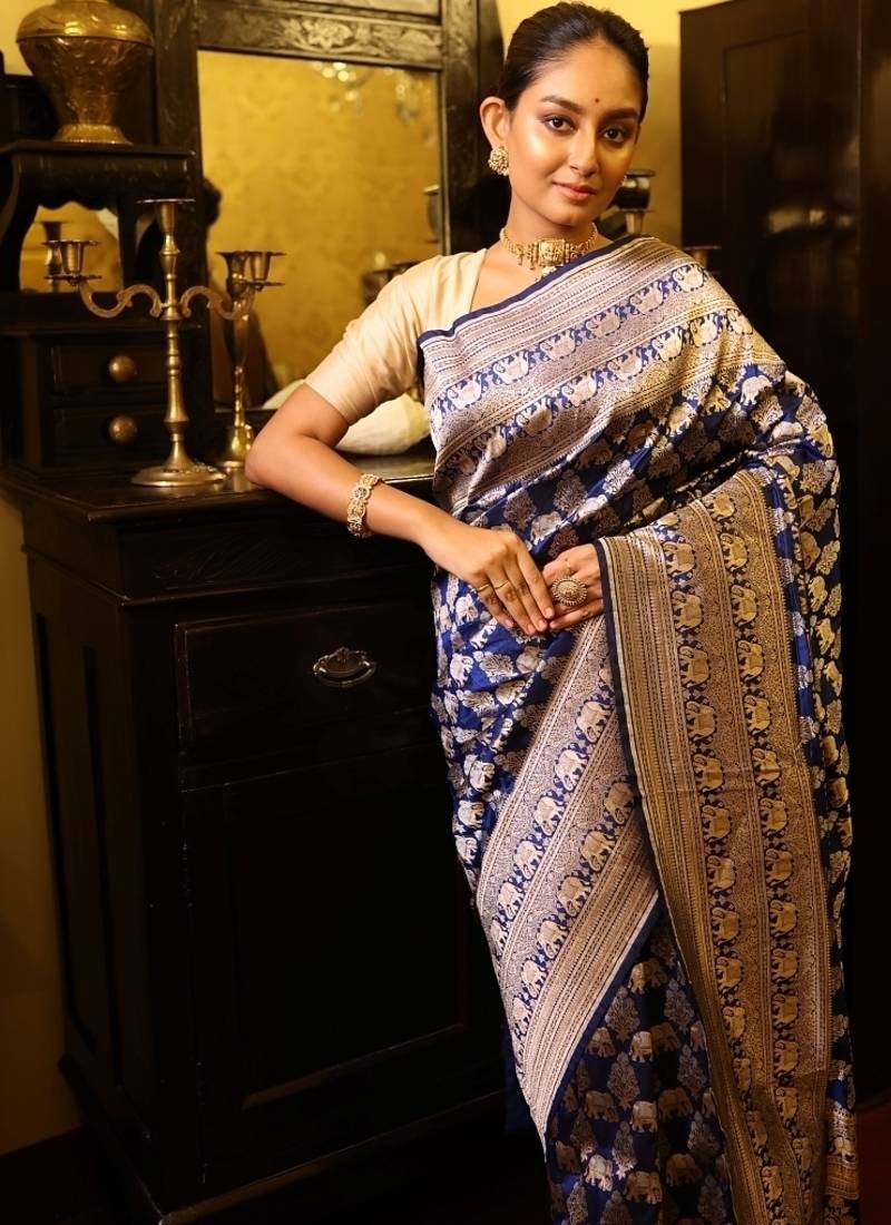 | Product Description | The Navy Blue Pure Katan Handloom Banarasi Shikargah Saree Is Stunning Tribute To Traditional Artistry. The Deep Navy Silk Base Is Adorned With All Over Elephant Motifs Woven In Exquisite Sona Rupa Zari—A Harmonious Blend Of Gold & Silver Threads That Brings Regal Elegance & Intricate Details.
