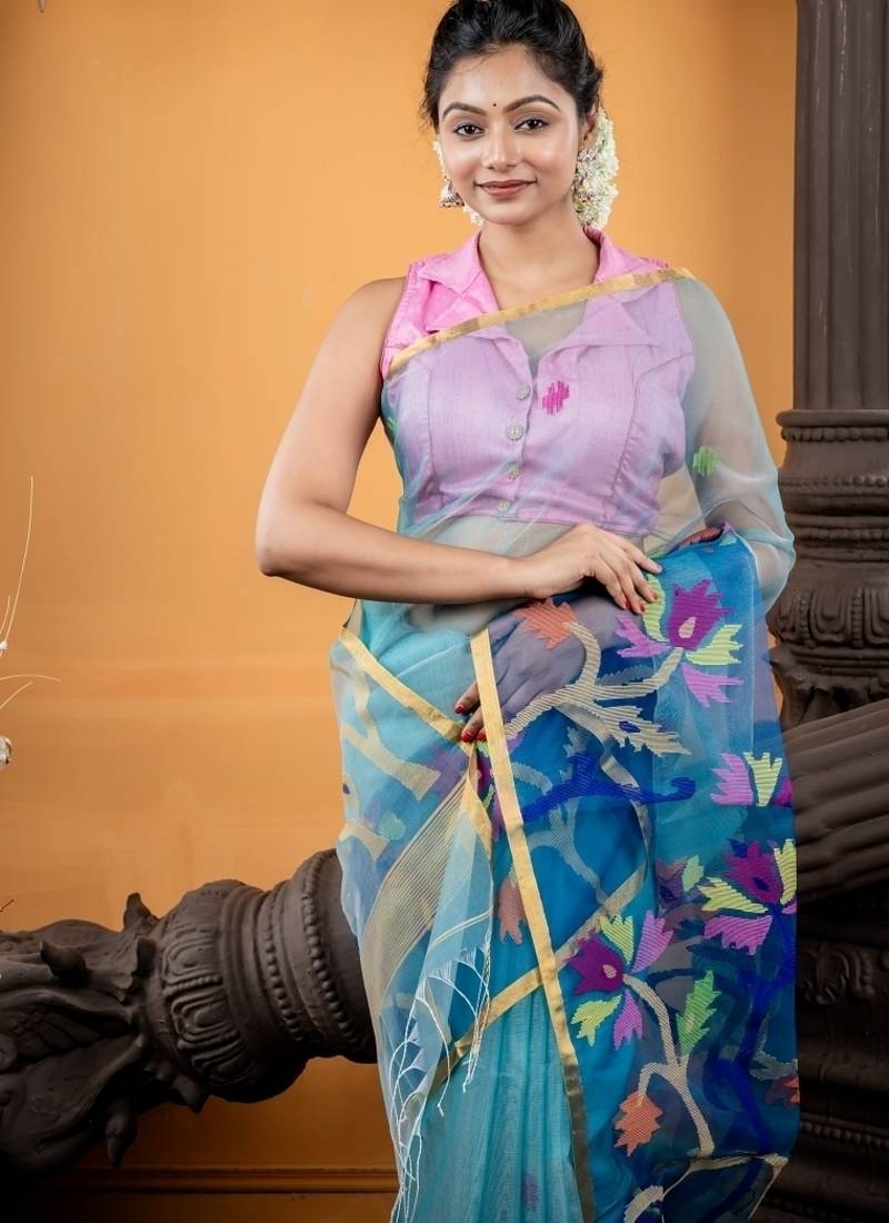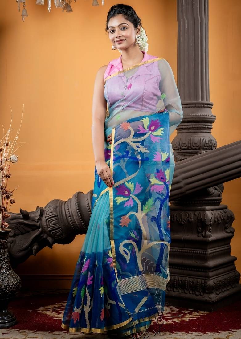 | Product Description | The Aqua Blue Premium Muslin Bengal Handloom Saree Is Adorned With All Over Multi Colour Jamdani Buta, Perfectly Complemented By Rich Peacock Blue ‘Mahapadh Floral’ Border & Pallu That Adds Depth & Character.