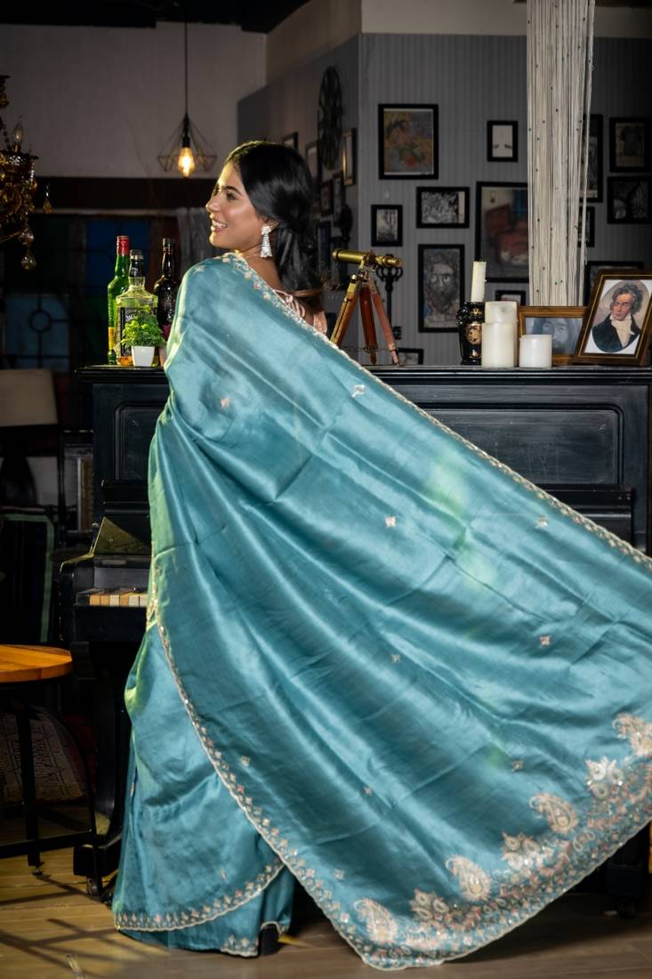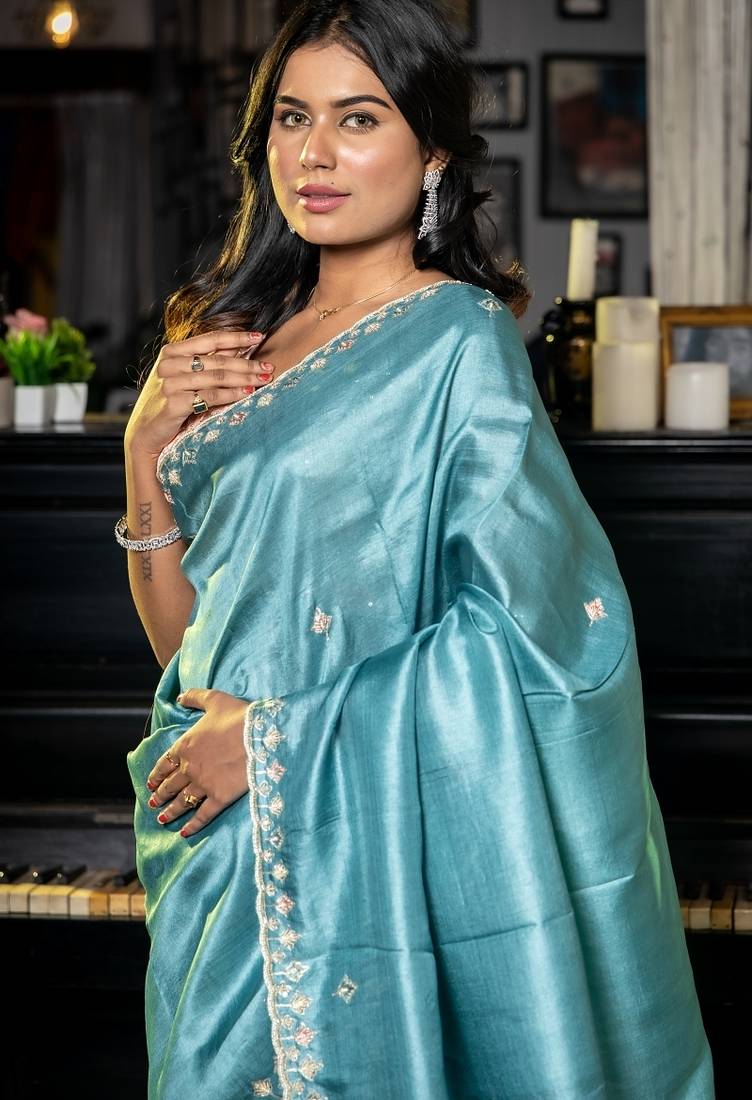 | Product Description | A Serene Treasure , The Dusty Blue Pure Tussar Silk Saree Radiates Elegance & Intricate Craftsmanship. The Tussar Silk Base Is Adorned With All Over Multi Colour Resham Floral Butis, Each Carefully Hand Embroidered To Showcase Heritage Artistry. Enhanced With Delicate Pita Zari, Moti & Zardozi Highlights, It Gleams With A Subtle, Luxurious Shimmer.