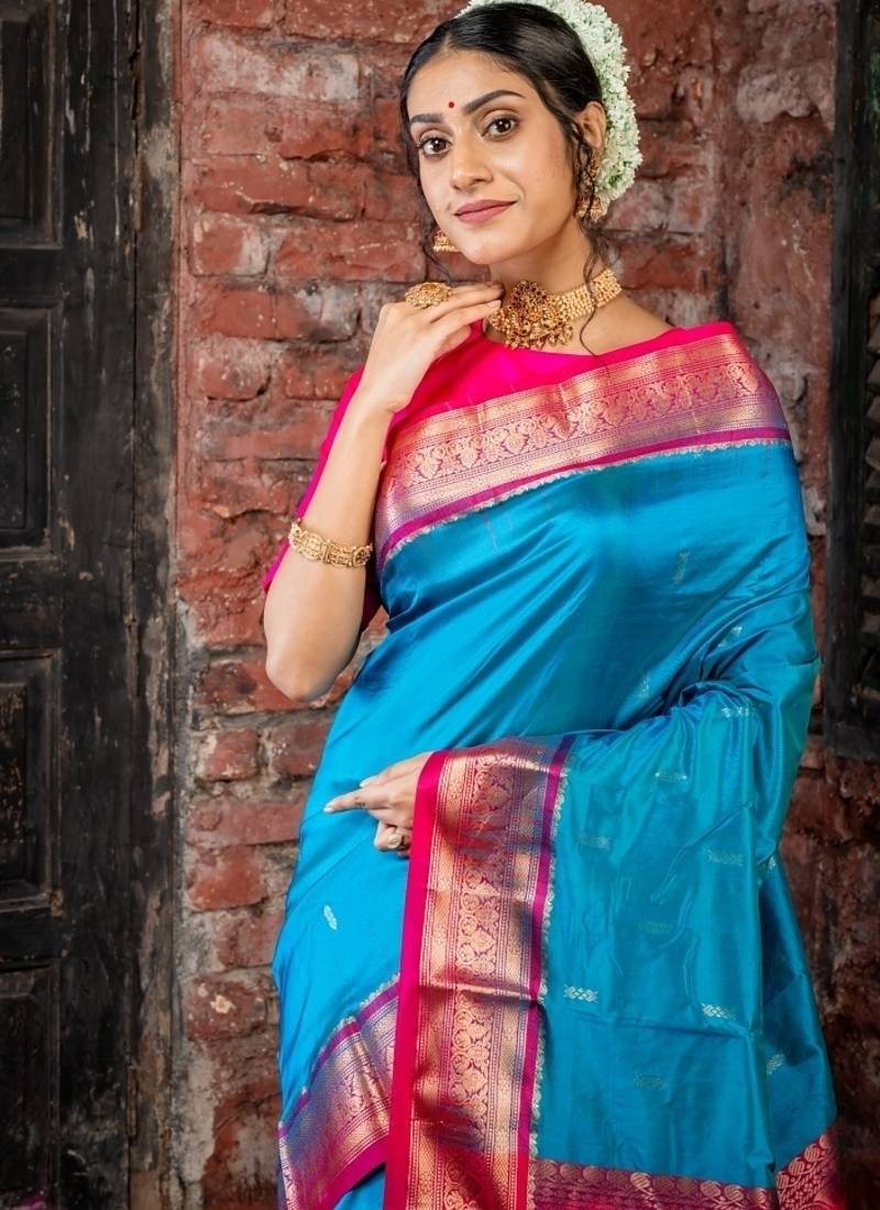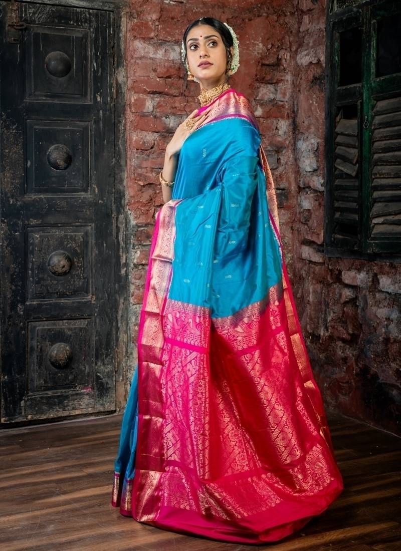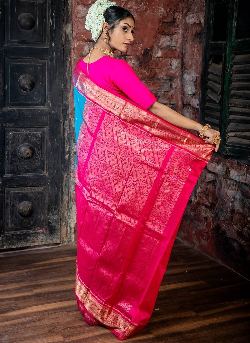 | Product Description | The Bright Cyan Blue Kanjivaram Silk Saree Is A Radiant Expression Of South Indian Luxury. The All Over Matte Gold Zari Buta Glistens Against The Luminous Silk Body, While The Magenta & Matte Gold Zari Border Creates A Rich Contrast. It Is Completed With Magenta Pallu Woven In Traditional Matte Gold Zari ‘Kalka’ & Floral Designs, Making It A Perfect Choice For Weddings, Temple Ceremonies, Or Festive Occasions.
