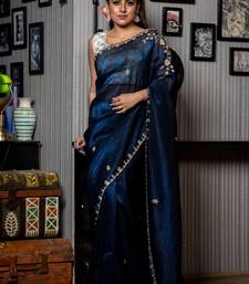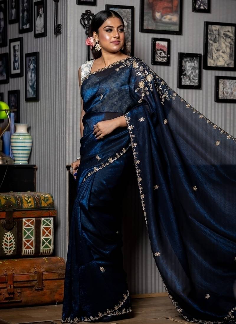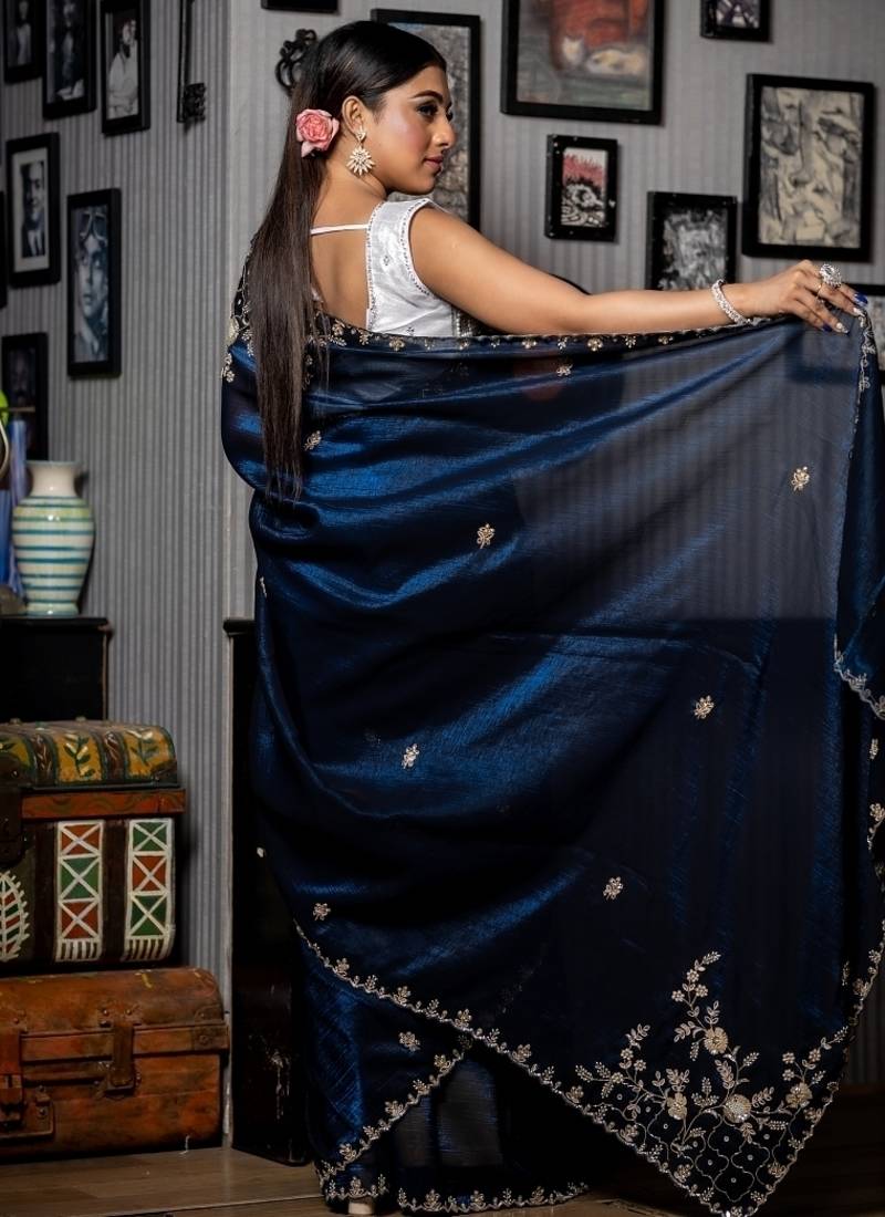 | Product Description | The Navy Blue &Electric Blue Dual Tone Shimmer Silk Base Shimmers With Movement, Adorned With Cut Dana, Mirror & Moti Handwork Floral Buta Across The Body, Richly Embellished Borders, & A Pallu Decked With Sequins, Moti, Mirror, Stone & Cut Dana Work. It's A Celebration Of Opulence, Perfect For Weddings, Receptions Or Any Grand Soirée.