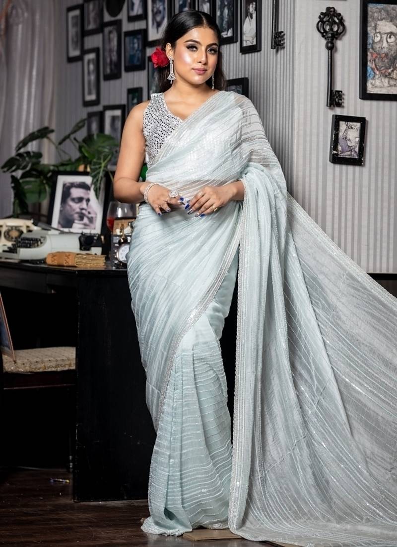 | Product Description | The Ice Blue Soft Organza Fancy Saree Embodies Delicate Sophistication. The All Over Silver Cut Dana &Ice Blue Sequins Handwork Stripes Create A Mesmerizing Pattern Across The Soft Organza Fabric, While The Sleek Border With Stone Highlights Adds Just The Right Amount Of Sparkle & Refinement. Perfect For Elegant Soirées, Receptions, Or Festive Occasions Where Subtle Glamour Is Key.