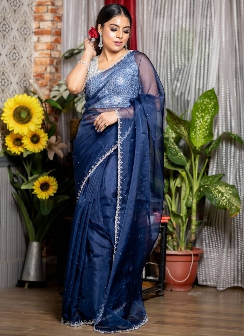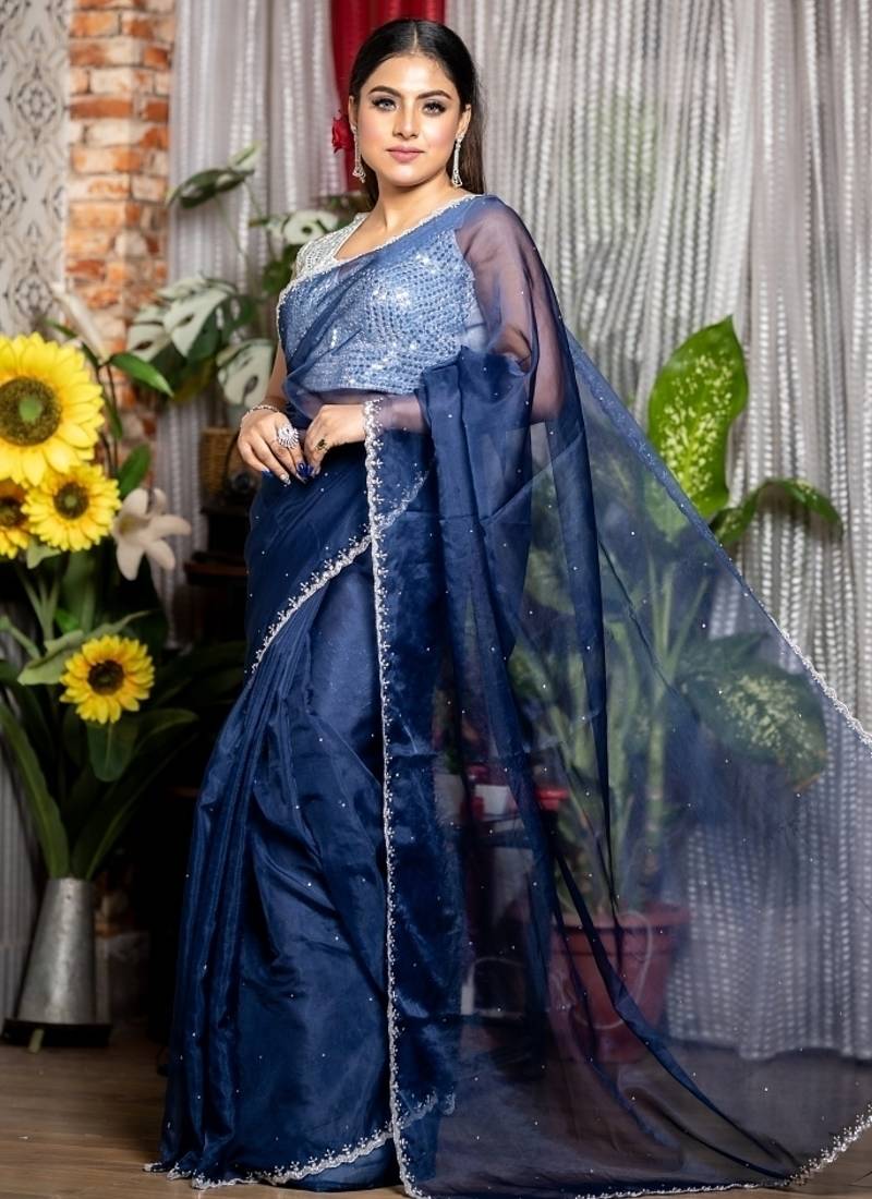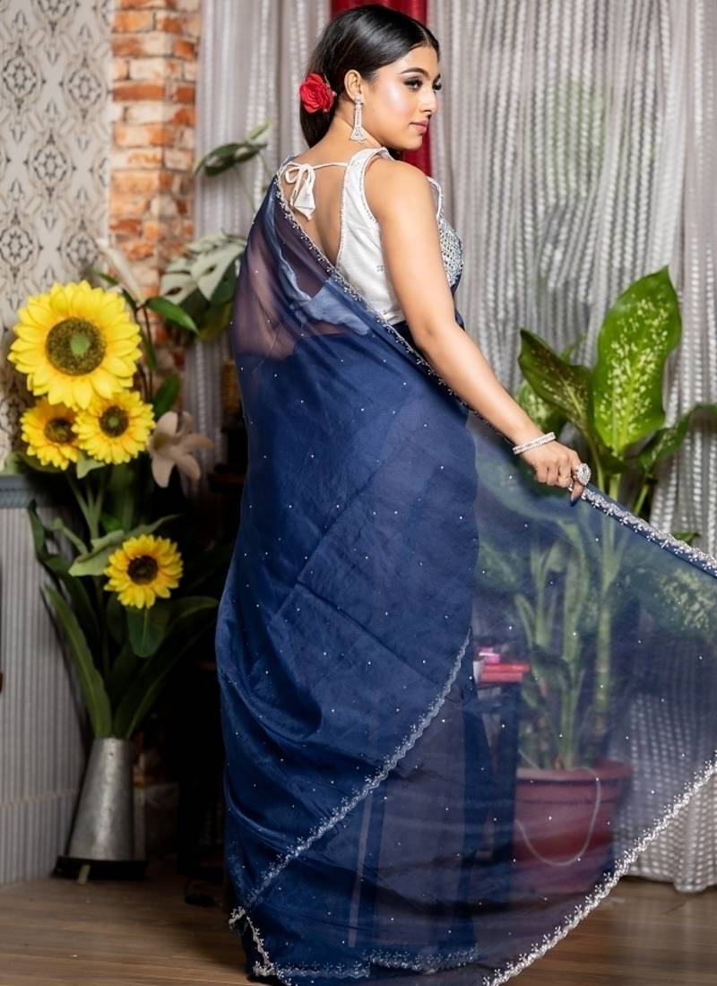 | Product Description | The Navy Blue Soft Organza Saree Showcases An All Over Plain Body Highlighted By An Exquisitely Detailed Border Featuring Stone, Silver Cut Dana, & White Moti Handwork — Offering The Perfect Harmony Of Bold Colour & Refined Embellishment.