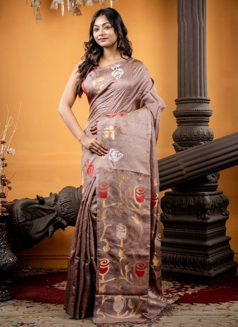 | Product Description | A Romantic Classic , The Rosy Brown Pure Tussar Silk Saree Captures Quiet Elegance Through Its Soft Texture & Artistic Detailing. Adorned With Handwoven Red & White Rose Motifs Scattered Across Its Graceful Body, It Is A Tribute To Timeless Femininity. The Antique Gold Highlights On The Border & Pallu Add A Subtle Glow.