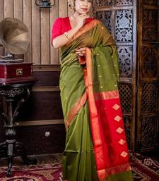 Green hand woven silk blend cotton zari work all seasons sarees