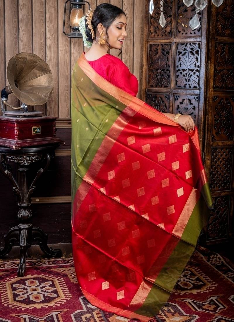 | Product Description | The Dark Moss Green Cotton Resham Maheshwari Handloom Saree Is A Refined Piece Of Everyday Luxury. The Cotton Resham Fabric Is Detailed With All Over Matte Gold Zari Buta That Lends A Soft Sheen To The Rich Moss Green Body. A Red Clay & Antique Gold Zari Brocade Border Complements The Red & Antique Gold Pallu, Woven With Stripe & Traditional Motifs.