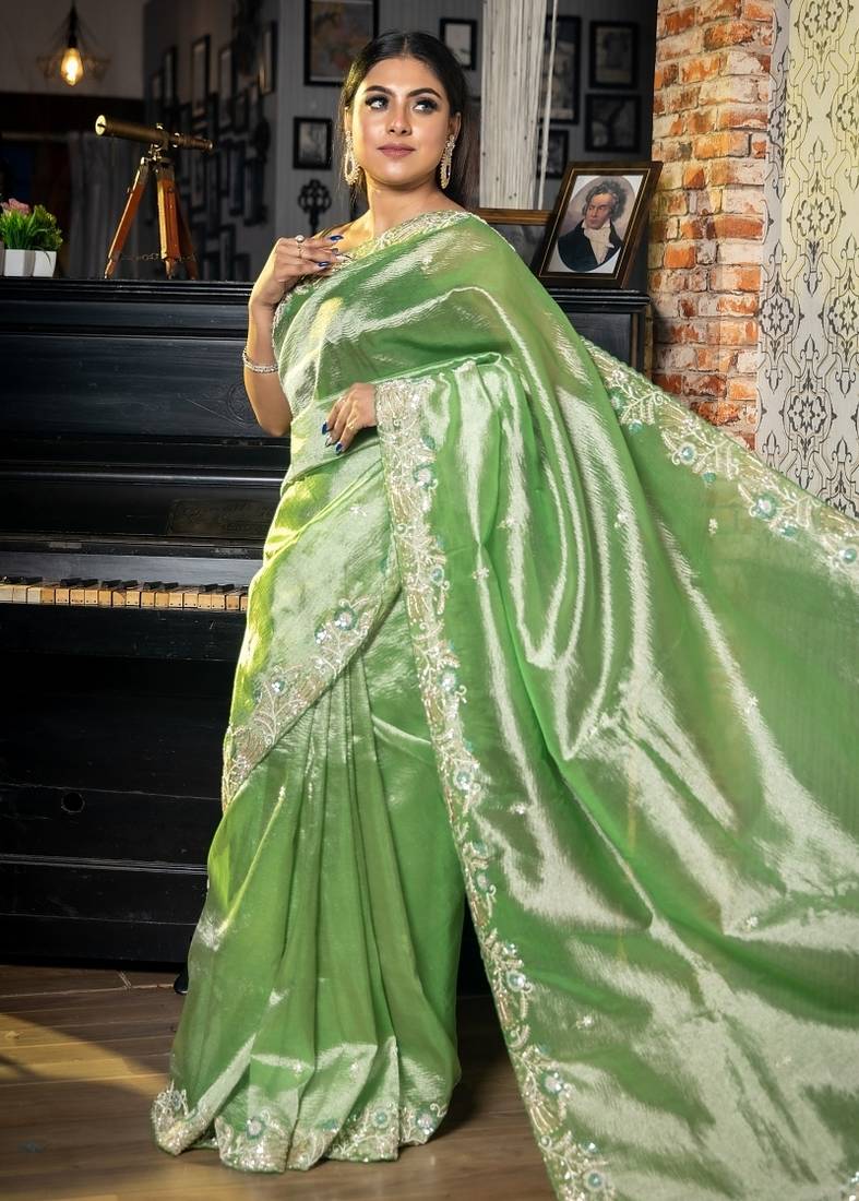 | Product Description | The Metallic Light Parrot Green Crushed Tissue Fancy Saree Is A Perfect Blend Of Sophistication & Sparkle. The All Over Moti, Cut Dana Sequins Handwork Glimmers On The Crushed Tissue Base, Creating A Play Of Light & Texture. Finished With A Stone, Matte Copper Zardosi Border, It Is A Radiant Choice For Day To Night Celebrations.