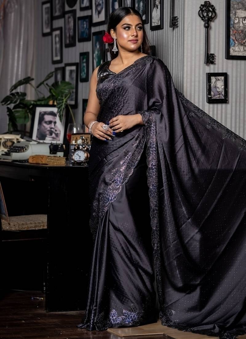 | Product Description | The Gunmetal Grey Satin Crepe Base Saree With All Over Swarovski & Metallic Blue Rhinestone &Swarovski Handwork Floral Motif Border. The Smooth Satin Crepe Fabric Offers A Subtle Sheen That Beautifully Enhances The Intricate Sparkling Floral Designs Along The Border, Creating A Look That Is Both Elegant & Eye Catching.