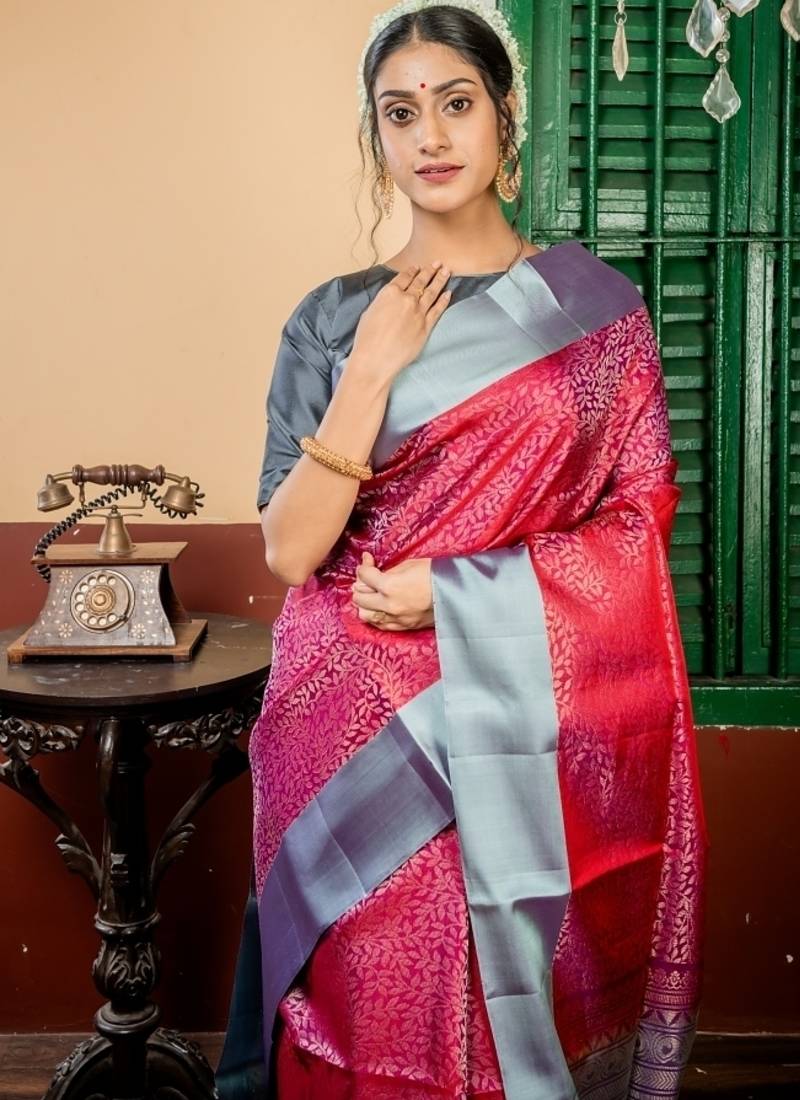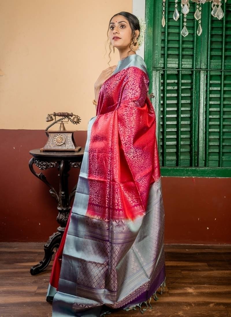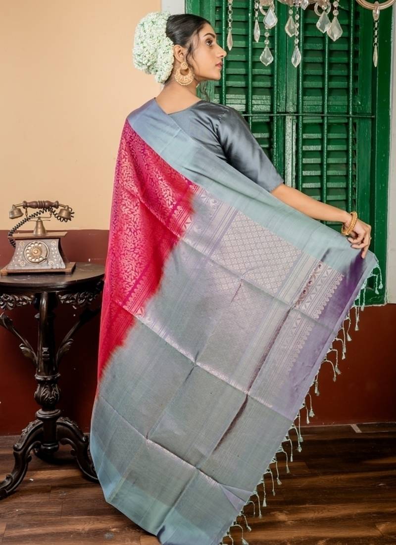 | Product Description | The Maroon &Purple Dual Tone Pattu Soft Silk Handloom Saree Is A Celebration Of Depth, Contrast & Heritage. The Fabric Is Adorned With All Over Matte Gold Zari Floral Jaal, Creating A Delicate & Regal Texture Throughout The Dual Toned Maroon & Purple Base. A Light Slate Grey & Purple Dual Tone Border & Pallu With Matte Gold Zari In Traditional Motifs Adds Refined Contrast & Elegance.