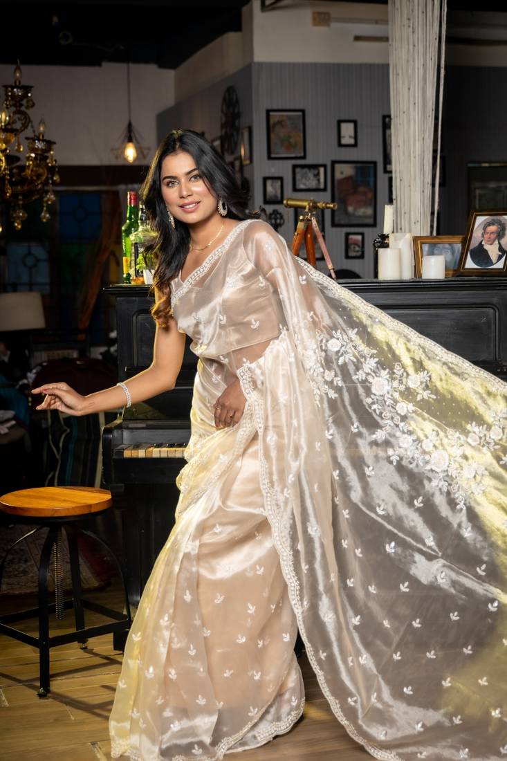| Product Description | The Light Champagne Glass Tissue Fancy Saree Features All Over Sequins & Cut Dana Handwork Floral Buta, Paired With A Richly Adorned Floral Border Combining Moti, Cut Dana, Two Tone Sequins, & Matte Gold Zardosi For A Stunning Finish.