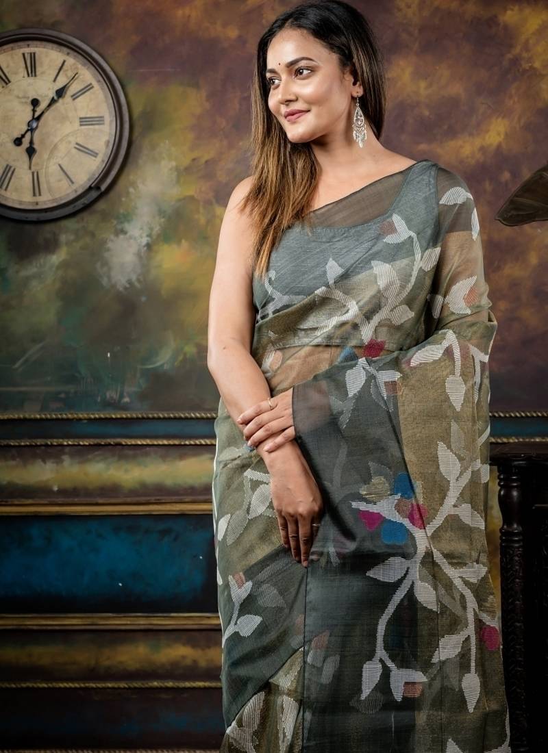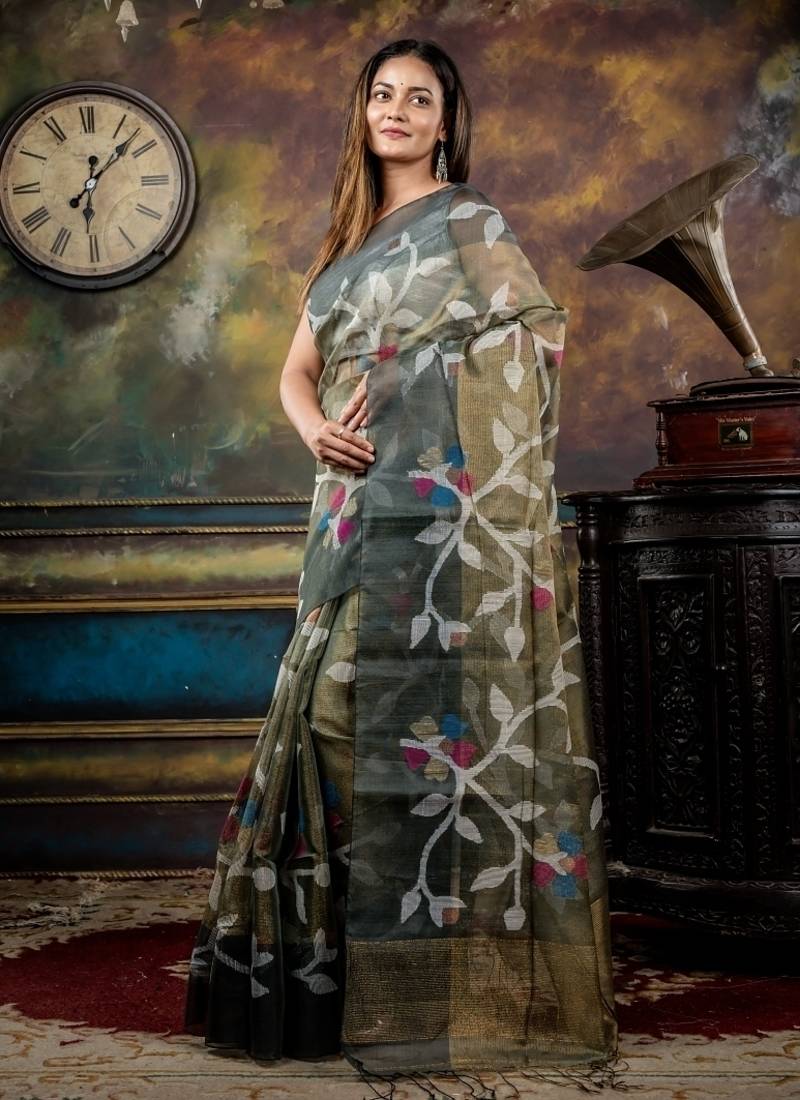 | Product Description | The Sage Green &Antique Gold Dual Tone Premium Tissue Muslin Bengal Handloom Saree Is Adorned With All Over Multicolour & Copper Zari Floral Jamdani Buta Across The Body & Pallu, Finished With A Deep Dark Grey ‘Mahapadh’ Border.
