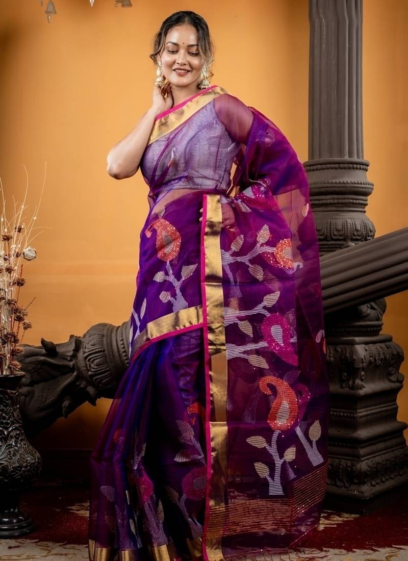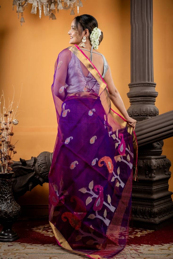 | Product Description | The Purple &Peacock Blue Dual Tone Premium Muslin Bengal Handloom Saree Features All Over Multicolour Traditional Aam Kalka Motif, Which Gracefully Extends Into The Pallu. Accentuated With Shimmering Silver & Gold Zari & Delicate Sequins, Each Element Reflects Opulence Rooted In Tradition.