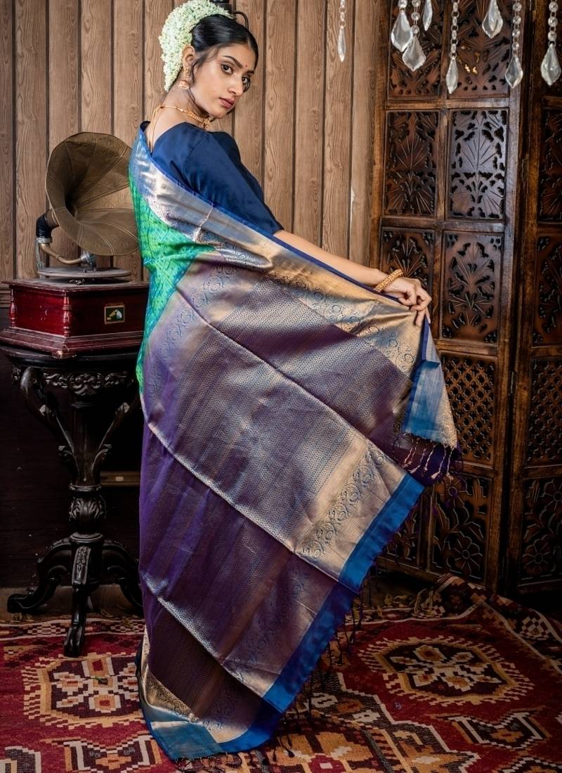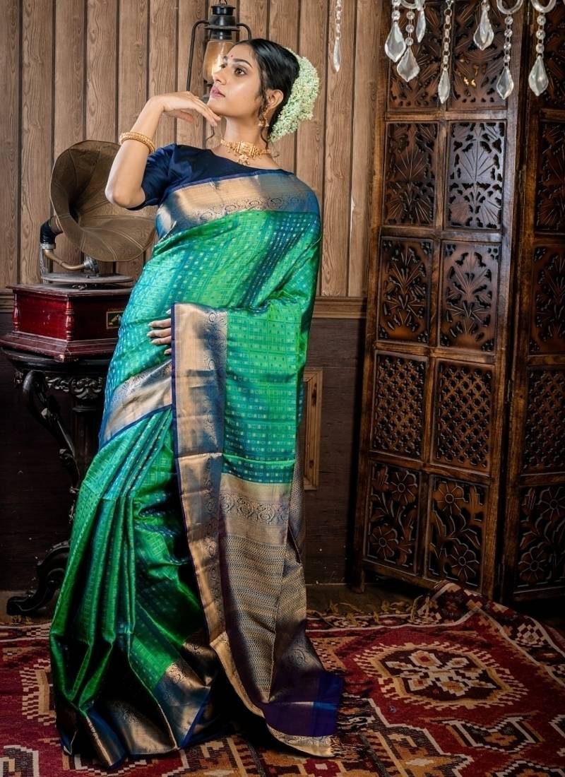 | Product Description | The Leaf Green &Peacock Blue Dual Tone Pattu Soft Silk Handloom Saree Is A Stunning Showcase Of Tradition & Colour. The Pattu Soft Silk Base Features All Over Antique Gold Zari, Peacock Blue Resham, & Leaf Green Resham Buta & Checks, Bringing Intricate Texture & Depth To The Fabric. The Saree Is Enhanced By A Violet & Peacock Blue Dual Tone Border & Pallu With Antique Gold Zari Traditional Motifs. |
