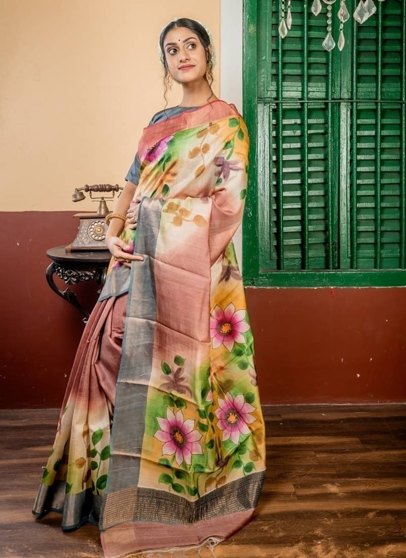 | Product Description | The Rose Taupe & Multicolour Shaded Pure Tussar Handloom Silk Saree Weaves Tradition & Creativity In Every Thread. The Body Features Multicolour Floral Hand Painted Motifs, Creating A Delicate & Captivating Canvas. Complemented By Smokey Grey Copper Zari & Dark Dusty Pink Copper Zari Ganga Jamuna Border, It Embodies Handcrafted Elegance—Perfect For Festive Occasions, Receptions, Or Cultural Events.