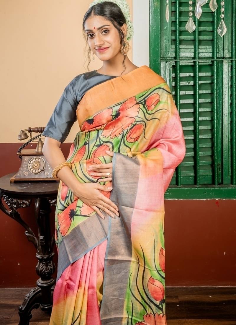 | Product Description | The Light Pink &Multi Colour Shaded Pure Tussar Handloom Silk Saree Is A Beautiful Fusion Of Tradition & Artistry. The Pure Tussar Silk Body Is Adorned With Multicolour Floral Hand Painted Motifs, Creating A Soft Yet Vibrant Canvas. Complemented By A Smokey Grey Antique Gold Zari & Light Tangerine Copper ‘Ganga Jamuna’ Border, This Saree Embodies Timeless Elegance—Perfect For Celebrations, Receptions, Or Cultural Events. |