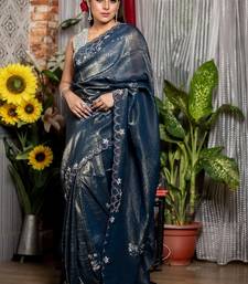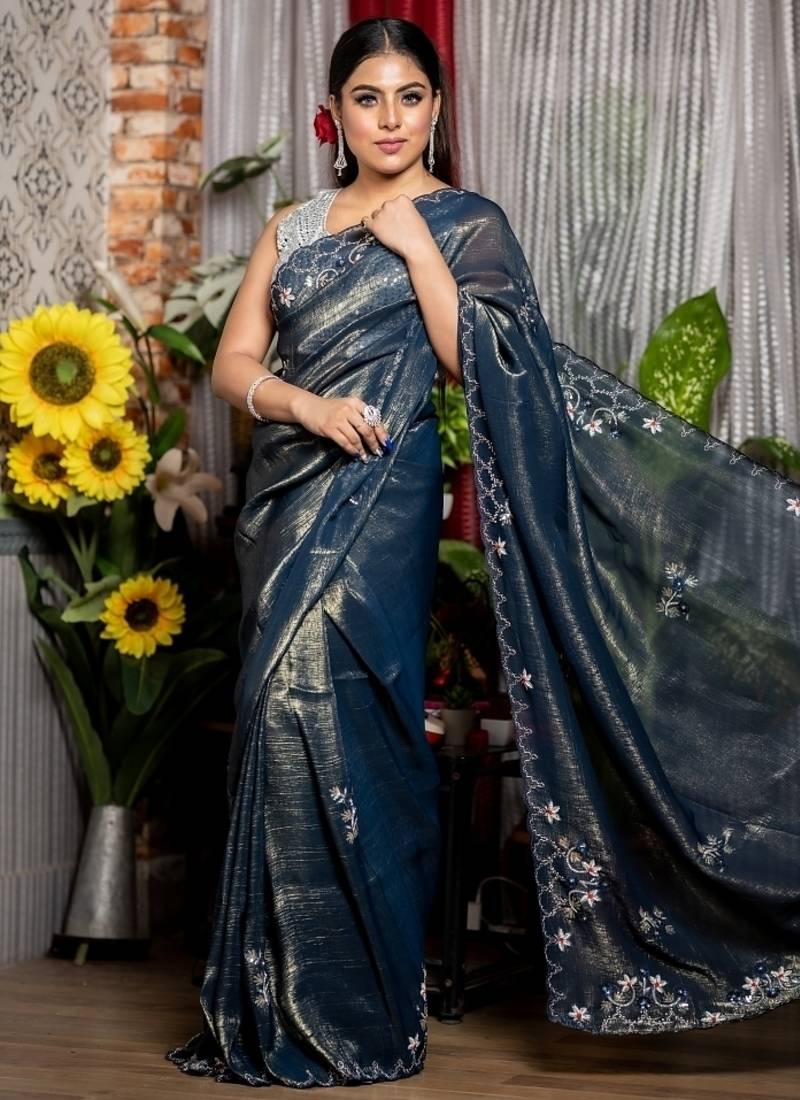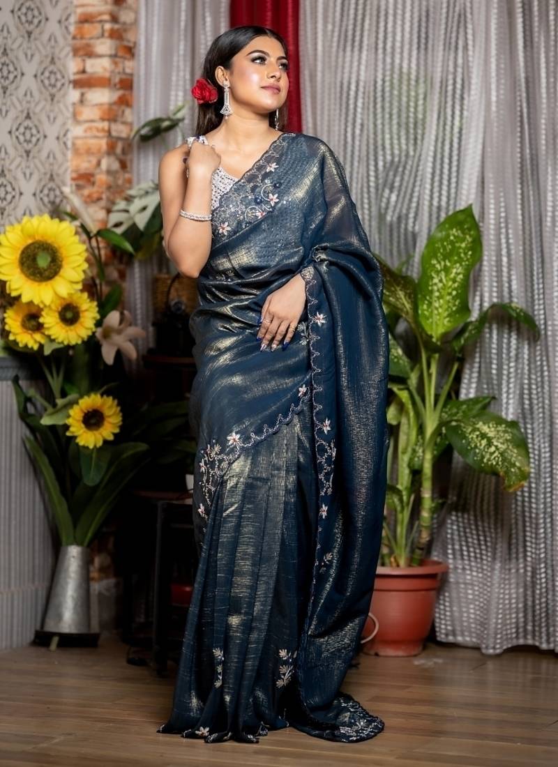 | Product Description | The Gunmetal Blue & Matte Gold Shimmer Organza Saree Showcases A Dazzling Interplay Of Blue & Gold Sequins, Cut Dana & Stone Handwork Floral Motif & An Elaborate Floral Border Enhanced With Moti, Sequins, Cut Dana, Resham, Zardosi & Stone.